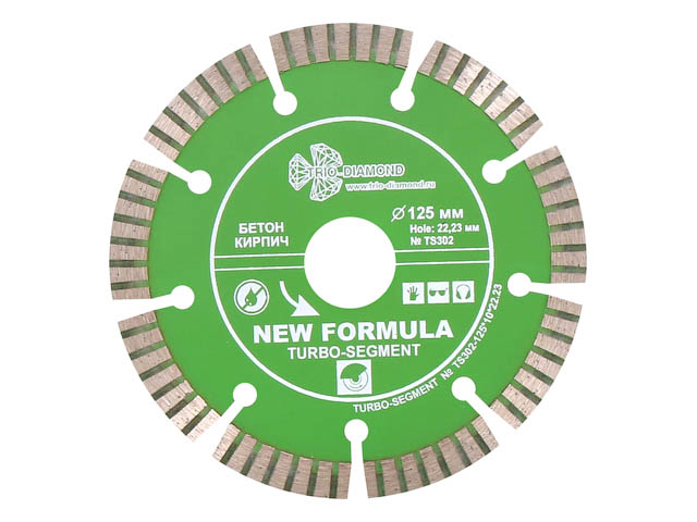 Диск сочетает в себе лучшие качества дисков Turbo (скорость реза и дополнительное охлаждение) и Segment (повышенная износостойкость). Не нуждается в дополнительном охлаждении водой. Примееняется для резки железобетона, бордюрного камня, мрамора, тротуарной плитки, шматочного кирпича и других высоко‑, среднеабразивных, абразивных материалов.
