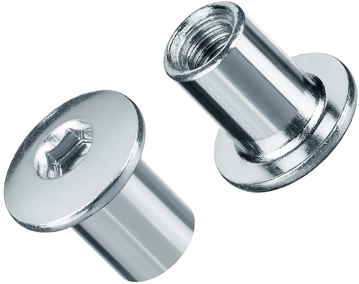 Используется с мебельным винтом для стягивания двух или более деталей, выполнена в форме цилиндара с внутренней метрической резьбой. Шляпка у гайки плоская, шлиц HEX