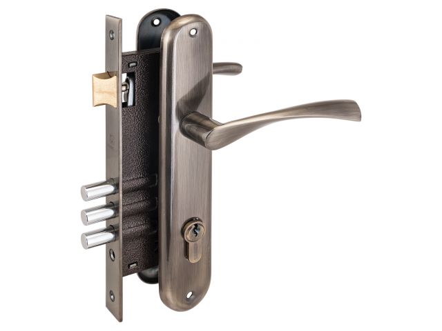 Три стальных ригеля круглого сечения диаметром 12мм, вылет 20мм. Универсальная защелка. Стальной корпус с подшипником, покрыт полимерной краской. Межосевое расстояние 85 мм. Удаление ключевого отверстия 45мм. Материал ручек алюминиевый сплав.