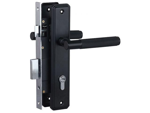 Замок врезной с комплектом ручек на планке. Предназначен для установки в деревянные двери толщиной 30 – 38 мм, правого и левого открывания. Материал ручки – прочный стальной пруток с продолжительным сроком службы. Удобная, безопасная форма с рифленой поверхностью. Материал планки – сталь. Покрытие комплекта ручек: катафорезное лакокрасочное, с высокой коррозионной стойкостью.