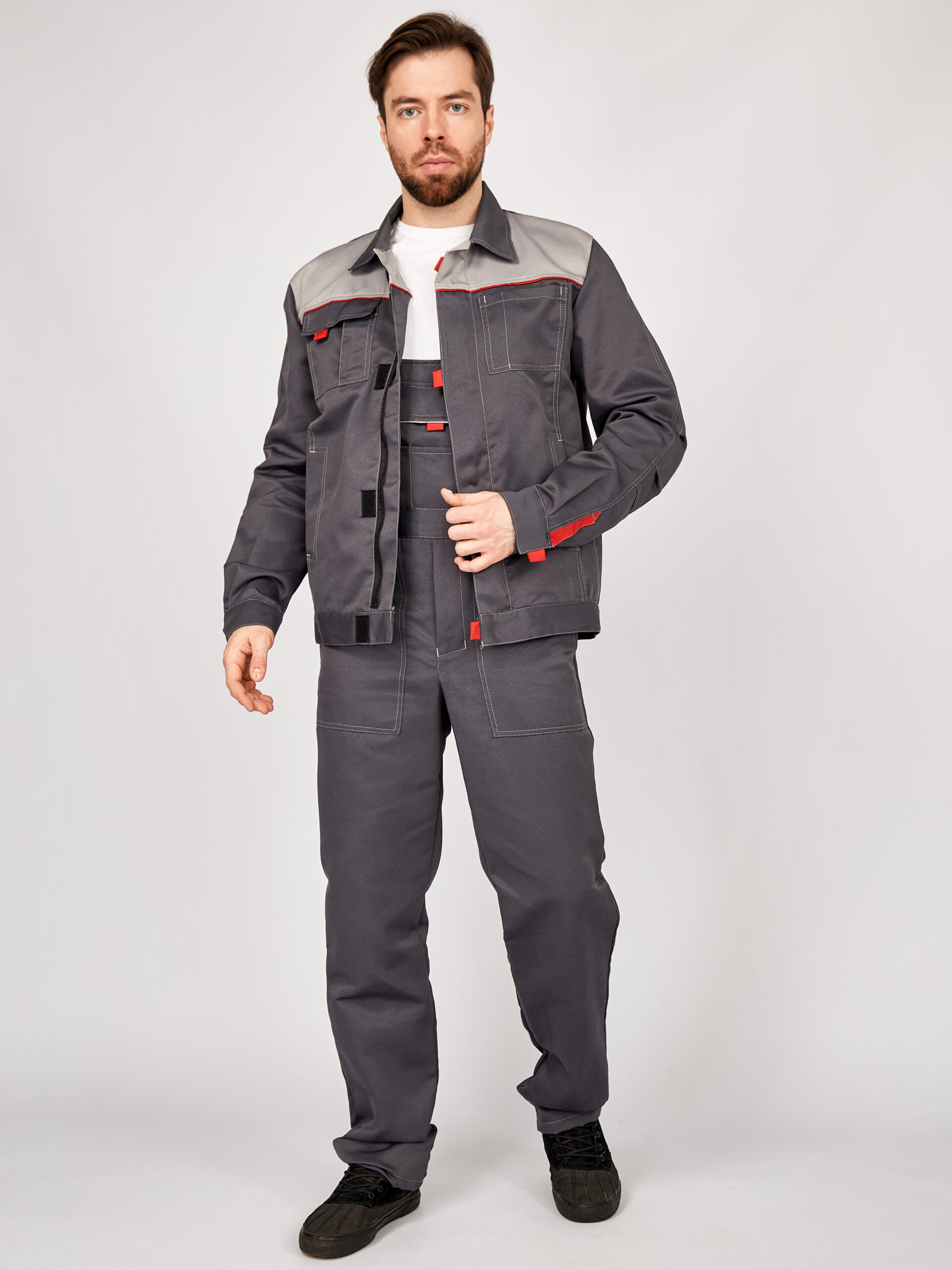 Полукомбинезон: прямого силуэта с застёжкой в левом боковом шве на три петли и пуговицу, гульфик на молнии. Бретели на резинках регулируются фастексами. На нагруднике двойной накладной карман с клапаном на контактной ленте, малый накладной карман разделён на три части. Боковые накладные карманы с наклонной линией входа. На задней половинке фигурный накладной карман. Двойной карман для инструментов.