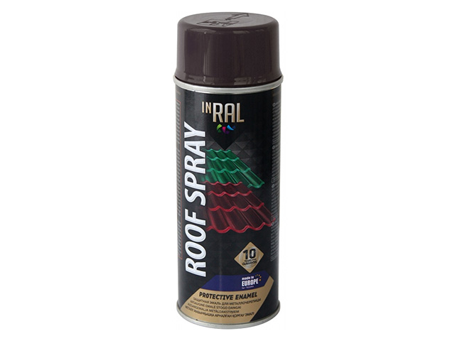 Краска-эмаль аэроз. для мелалл. конструкций INRAL 400мл – быстросохнущая аэрозольная краска на алкидной основе для декоративной покраски кровельных покрытий и водостоков в местах повреждений/для удаления дефектов. Для внутренних и наружных работ. Обладает отличным блеском и покрываемостью поверхностей. Не обладает антикоррозийными и защитными свойствами. Инструкция по эксплуатации: очистите и обезжирьте поверхность. Энергично встряхните баллон в течение 1 мин. Равномерно распылите на поверхность с расстояния 30см. Рабочая температура: +10°C…+25°C. Наилучшая температура покраски: +20°C. Время сушки: 10мин. Если температура ниже +18°C, время высыхания увеличивается. Рекомендуемое количество слоев: 2–3. Площадь покрытия: 2м2. Хранить в недоступном для детей месте. Хранить в вертикальном положении в сухом месте при температуре +5°C…+25°C. Не подвергайте баллоны воздействию прямых солнечных лучей или нагреванию свыше +50°C. Температура транспортировки: ‑15°C…+25°C.
