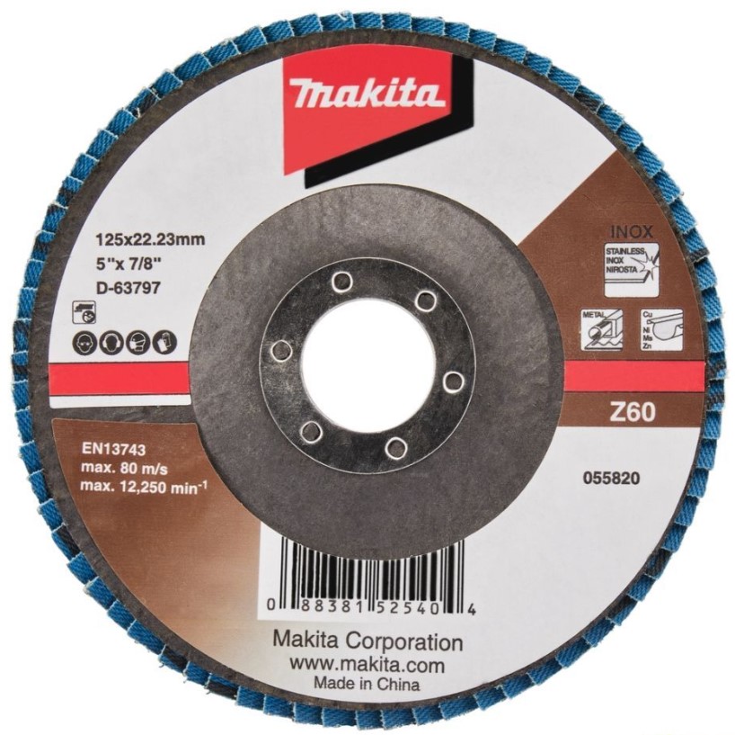 Диск лепестковый шлифовальный 125x22.23 мм, Z60, стекловолокно, угловой Makita D‑63797. Благодаря циркониевому корунду, а так же отсутствию оксида железа в составе диск отлично подходит для работ по нержавеющей стали и металлу. Обладает повышенной износостойкостью и отлично справляется со снятием заусенцев, удалением следов побежалости, ржавчины и краски.