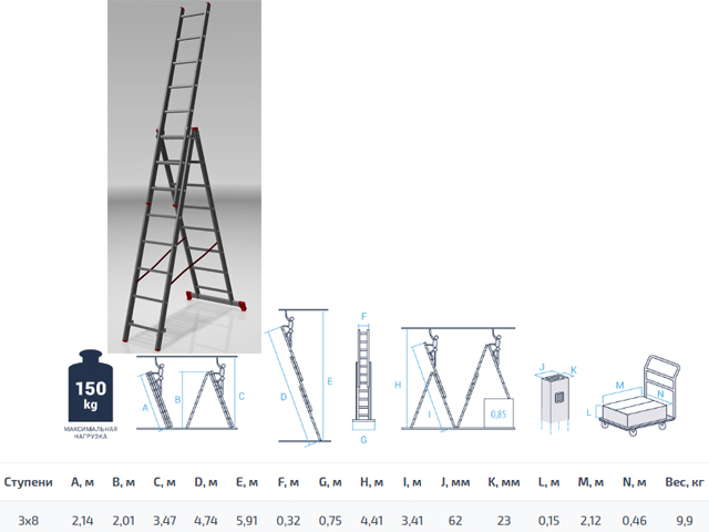 Высота лестницы – 475см, высота стремянки – 202см, высота секции – 215см.