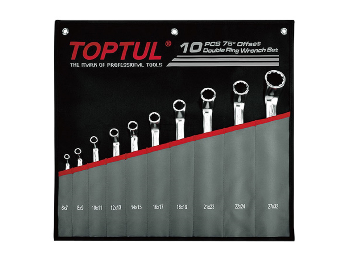 Набор ключей накидных TOPTUL состоит из 10 инструментов размером 6х7, 8х9, 10х11, 12х13, 14х15, 16х17, 18х19, 21х23, 22х24 и 27х32 мм серии AAEI0607-2732. Все ключи изогнуты на 75 для работы в труднодоступных местах. Набор оснащен удобным чехлом черного цвета с отдельным карманом для каждого ключа. Чехол можно повесить на стену.