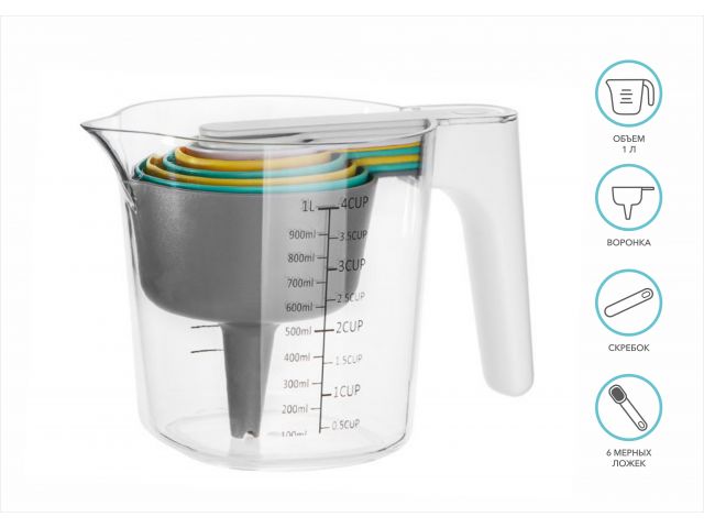 В наборе: мерный стакан объемом 1 л, воронка, скребок, 6 мерных ложек