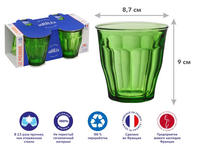 Коллекция Picardie известна своим культовым дизайном от ТМ Duralex , который подойдет к любому столу и событию. Практичные, эстетичные, прочные и эргономичные стаканы. Зеленый оттенок придаст изысканный вид сервировке стола. Стеклянная посуда ТМ Duralex производится во Франции с 1945 года. Процесс закаливания придает стеклу ТМ Duralex особую прочность. Во время закаливания стекло ТМ Duralex , предварительно нагретое до 700°С, подвергается резкому охлаждению холодным воздухом. Этот процесс делает стекло ТМ Duralex в 2,5 раза более устойчивым к механическим повреждениям, чем отожженное стекло. Характеристики: ударопрочное закаленное стекло, термостойкость до 130 ° C (EN 1183), можно мыть в посудомоечной машине, подходит для использования в микроволновой печи.