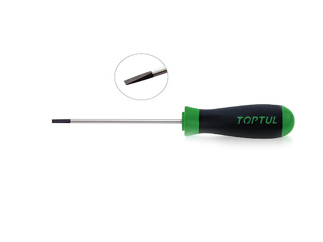Отвертка шлицевая SL3,5 100 мм узкая TOPTUL (FNAB3E10) используется квалифицированными специалистами различных сфер промышленности. Цельнозакаленный стержень отвертки изготовлен из конструкционной легированной стали и оснащен магнитным наконечником, высокоточная обработка узкого жала отвертки гарантирует максимальный контакт со шлицем крепежа. Двухкомпонентная рукоятка: термопластичный каучук и полипропилена гарантирует удобство в работе и предотвращает проскальзывание инструмента в руке.