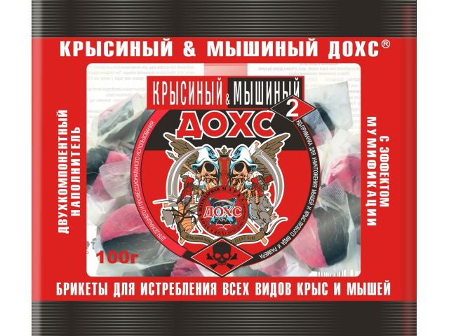 КРЫСИНЫЙ&МЫШИНЫЙ ДОХС готовая к применению двухкомпонентная приманка в виде мягких брикетов, окрашенных в яркие цвета. Предназначения для истребления мышей, крыс и др. грызунов населением в быту.