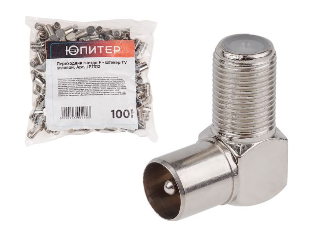 Переходник гнездо F – штекер TV угловой (100 шт.) Юпитер