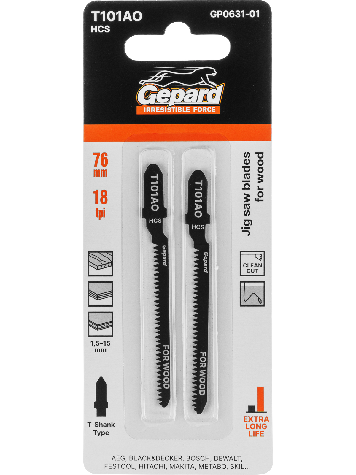 Назначение: сменный пильный элемент по дереву для электролобзиков. Используются для криволинейных пропилов в мягкой древесине, фанере, плитах с покрытием (1,5 – 15 мм). Пропил криволинейный, тонкий, аккуратный и чистый рез.