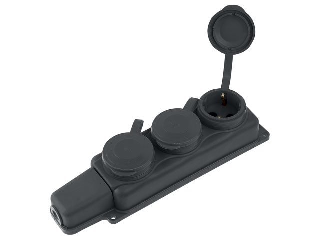 Розетка 3‑ая переносная (с/​з, 16А, 250В, брызг. защ.) каучук, черная, Юпитер