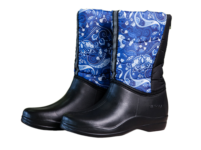 Сапоги женские. Представляют собой комбинированную модель, изготовленную на основе галоши из ЭВА, верх – из водоотталкивающей ткани, дублированной поролоном, и втачного утеплителя из искусственного меха. Температура тепла сохраняется до ‑30С. ЭВА прочный и при этом эластичный материал, сохраняющий свойства в морозную погоду. На поверхности не образуется грибок, ее легко отмыть от загрязнений обычной губкой и теплой водой. Модель выполнена на застежке-молнии сзади. Дизайн допускает использование как однотонных, так и цветных материалов.