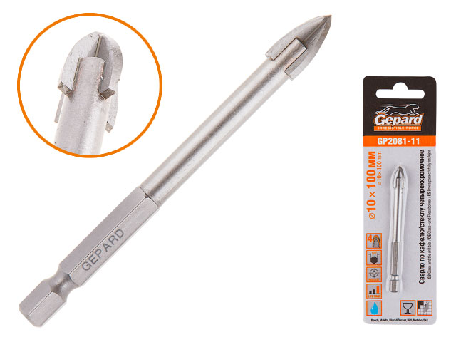 Сверло по кафелю/​стеклу 10х100мм четырехкромочное шестигр. GEPARD (GP2081-​11)
