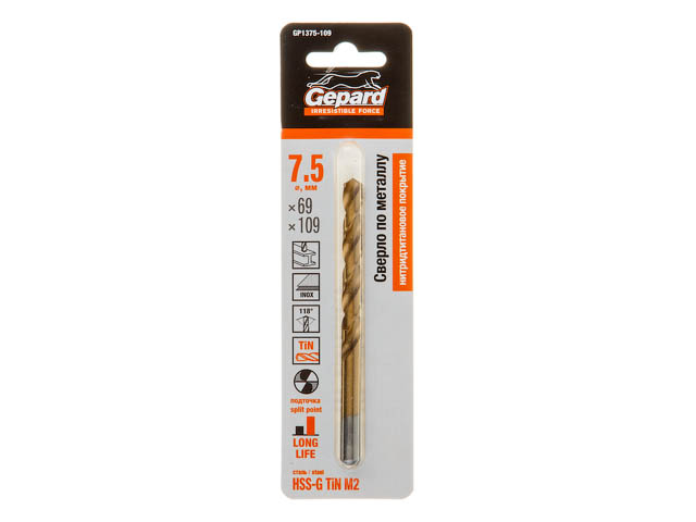 Сверло по металлу ц/х 7.5х69х109 мм HSS TIN GEPARD