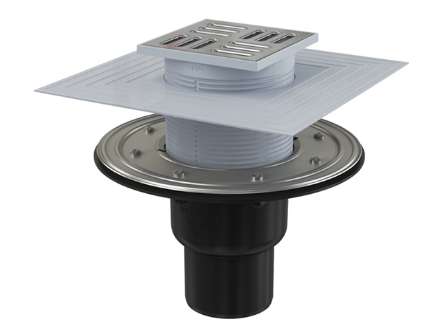 Сливной трап 105х105/50/75, прямой сток, решетка – нерж. сталь, гидрозатвор – комб. Alcaplast