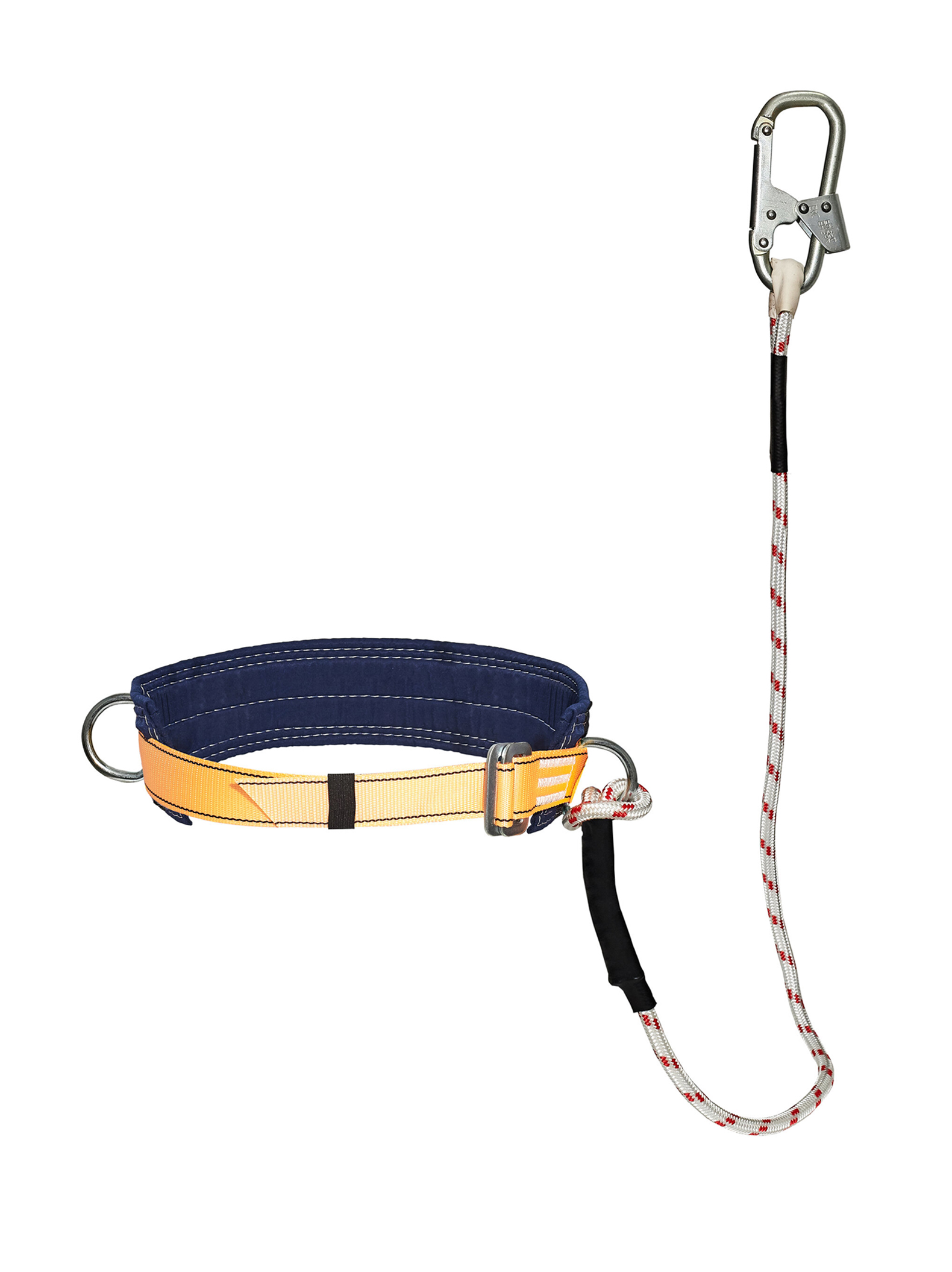 Состоит из ремня с пряжкой, кушака и двух D‑колец для присоединения стропа. Удерживающая система оснащена стропом из 24‑х прядной полиамидной верёвки (строп В) с монтажным карабином.