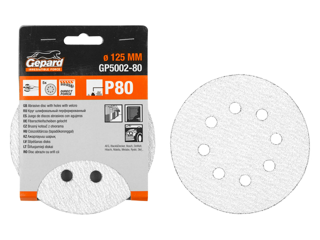 Шлифлист 125мм круг Р180 д/краски 8 отв. 5шт. GEPARD (GP5002-180)